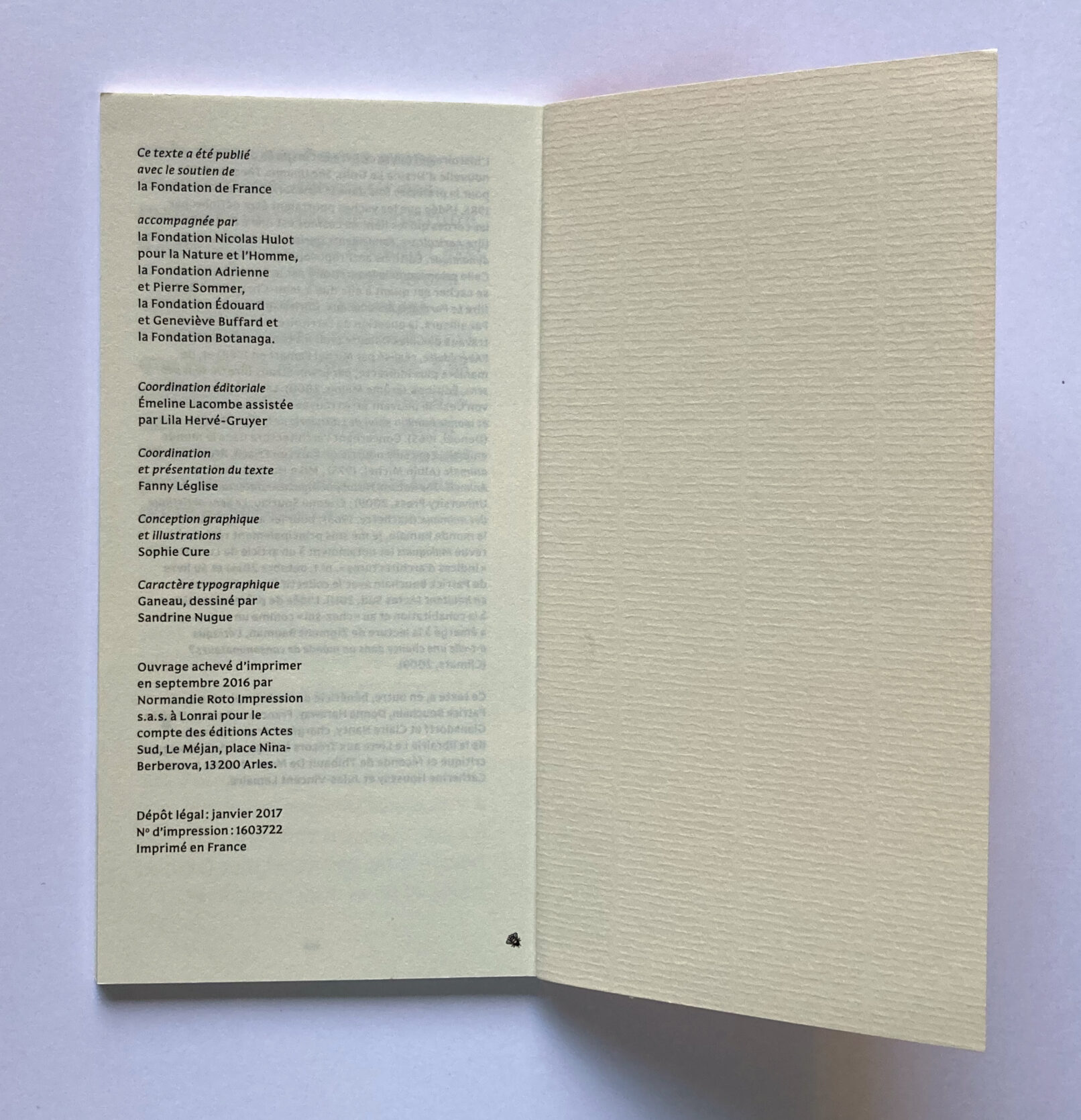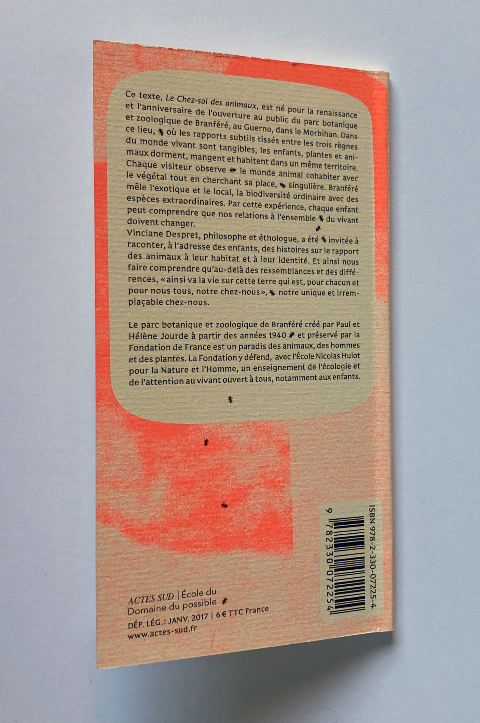 Rédaction de la présentation et de la quatrième de couverture du livre, coordination éditoriale, Actes Sud-École du Domaine du possible, ISBN 978-2-330-07225-4. Vinciane Despret, philosophe et éthologue, raconte aux enfants des histoires sur le rapport des animaux à leur habitat et à leur identité. Ce court texte, en faveur de l’éducation à l’environnement, permet de comprendre qu’au-delà des ressemblances et des différences, « ainsi va la vie sur cette terre qui est, pour chacun et pour nous tous, notre chez-nous ».