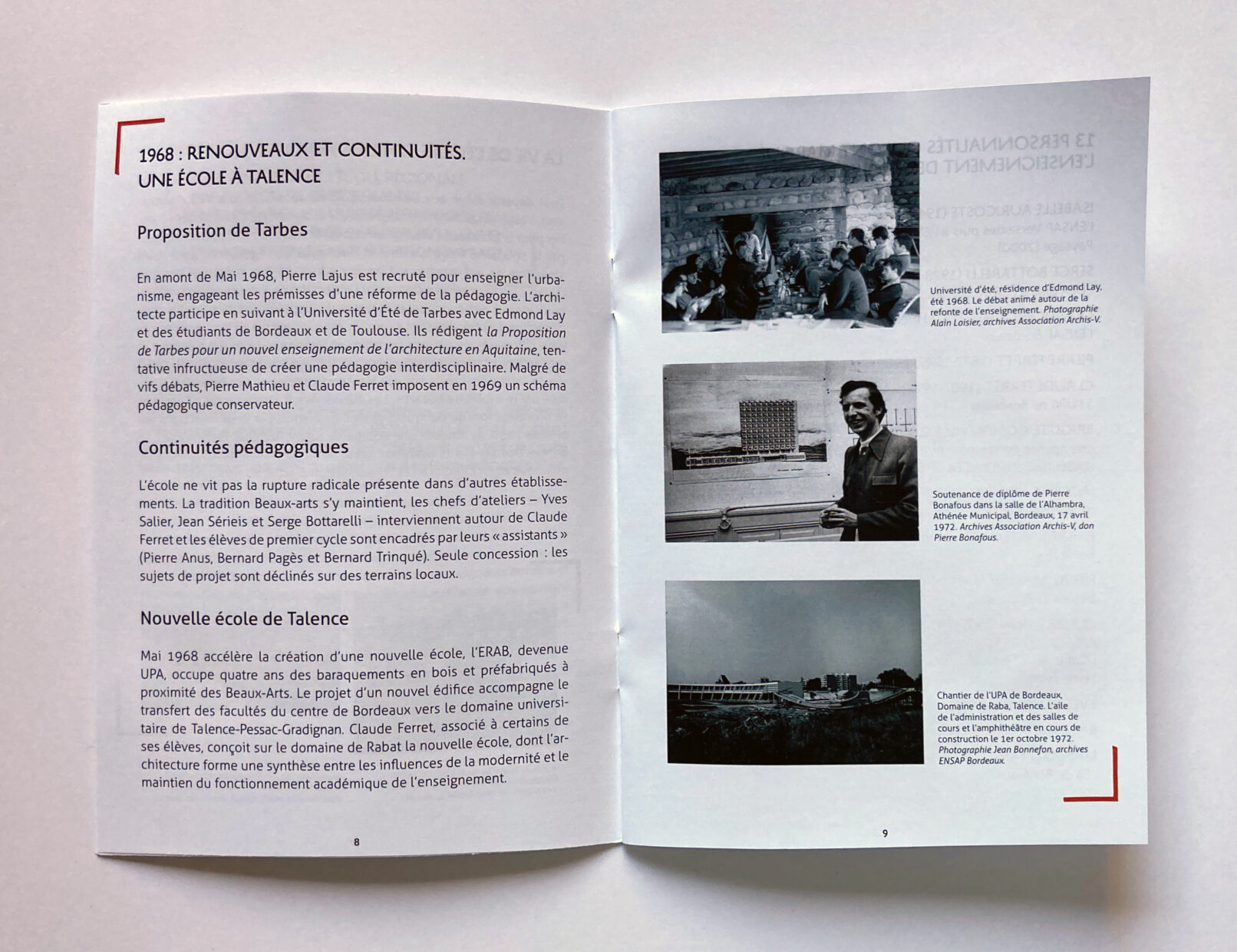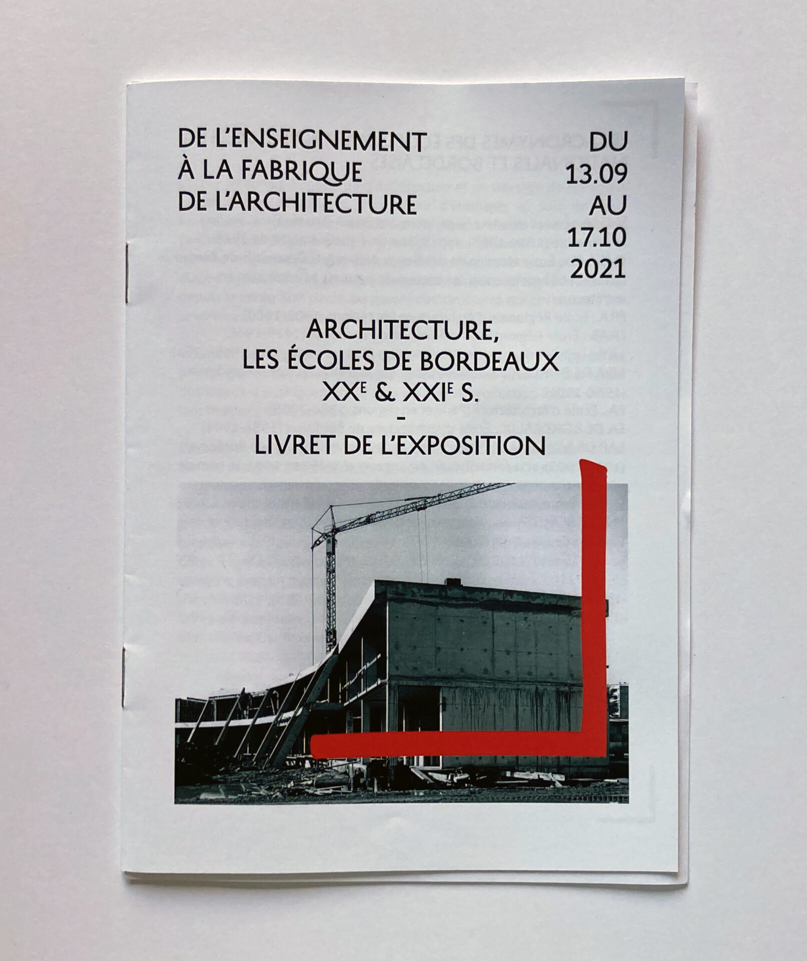 Architecture. Les école de Bordeaux a été présentée dans la salle des voûtes des Archives départementales de la Gironde du 16 septembre au 17 octobre 2021. L’exposition développait l’histoire de l’enseignement de l’architecture à Bordeaux marquée notamment par la création de l’École Régionale d’Architecture (1928), la construction de l’école de Talence (suite aux événements de mai 1968) et la fondation de l’école de paysage (1991).
