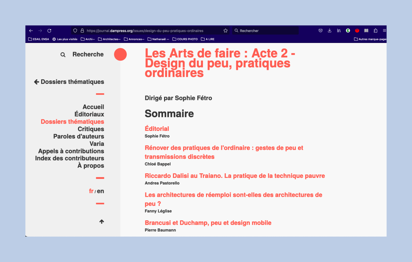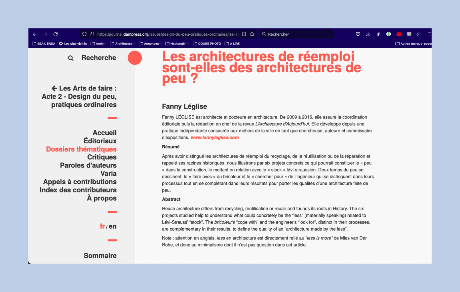 In Les Arts de faire : Acte 2 – Design du peu, pratiques ordinaires, dirigé par Sophie Fétro, revue en ligne Design Arts Média. Après avoir distingué les architectures de réemploi du recyclage, de la réutilisation ou de la réparation et rappelé ses racines historiques, nous illustrons par six projets concrets ce qui pourrait constituer le « peu » dans la construction, le mettant en relation avec le « stock » lévi-straussien. Deux temps du peu se dessinent, le « faire avec » du bricoleur et le « chercher pour » de l’ingénieur qui se distinguent dans leurs processus tout en se complétant dans leurs résultats pour porter les qualités d’une architecture faite de peu.