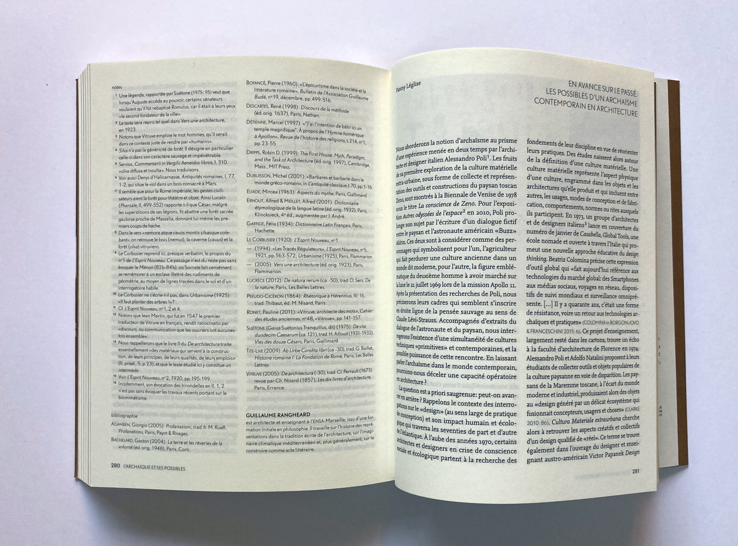 La production architecturale contemporaine est marquée par une résurgence de l’archaïque qui se manifeste par des formes, des procédés constructifs, des processus et des matériaux que l’on pourrait qualifier de primitifs. Cet archaïque contemporain correspond à un recentrement sur l’essentiel, ancré dans une attention à l’écologie, plutôt qu’à une nostalgie. L’article que j'ai rédigé, intitulé « En avance sur le passé » explore et prolonge la rencontre proposée dans les années 1970 par l’architecte Alessandro Poli entre Zeno, paysan toscan et Aldrin, astronaute américain. « En avance sur le passé.Les possible d'un archaïsme contemporain en architecture », paru dans L’archaïque et ses possibles. Architecture et philosophie, sous la direction de Stéphane Bonzani, Métis Presses, ISBN : 978-2-940563-77-7.